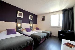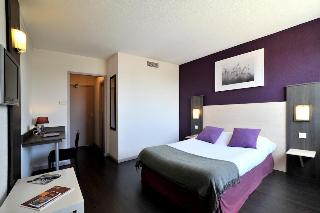 The hotel is located just 3 min from the beach, Carnon and Palavas. It is right by the exhibition centre and directly in front of the commercial centre. A number of restaurants to suit different tastes and budgets can also be found within walking distance. La Grande-Motte and the Camargue are just 15 min away, Montpellier city centre and its train station are 10 min away; and the international airport is only 3 min from the hotel.||This hotel in south Montpellier offers a warm and personalised welcome to all its guests. Completely renovated in 2005, the hotel offers a total of 74 spacious guest rooms on 2 floors, as well as a relaxation lounge with large television screen and bar. Further facilities include an entrance hall with 24-hour reception, a breakfast room, a conference facility, a WLAN access point and garage parking for those arriving by car.||The rooms are spacious (21 m²), with one double or 2 single beds, individual air conditioning and heating, an LCD flat-screen TV with Canal + and an en suite bathroom with bathtub. A direct dial telephone and Internet access also come as standard.||There is a golf course just 5 km away.||Guests can take advantage of the substantial and varied breakfast.||On the A9 motorway take exit 29 for Montpellier-Est, towards Les Plages La Grande Motte, and 2 km later exit at Parc des Expositions. The hotel is 400 m ahead on the right-hand side.