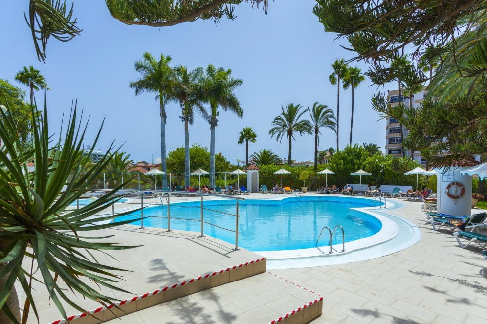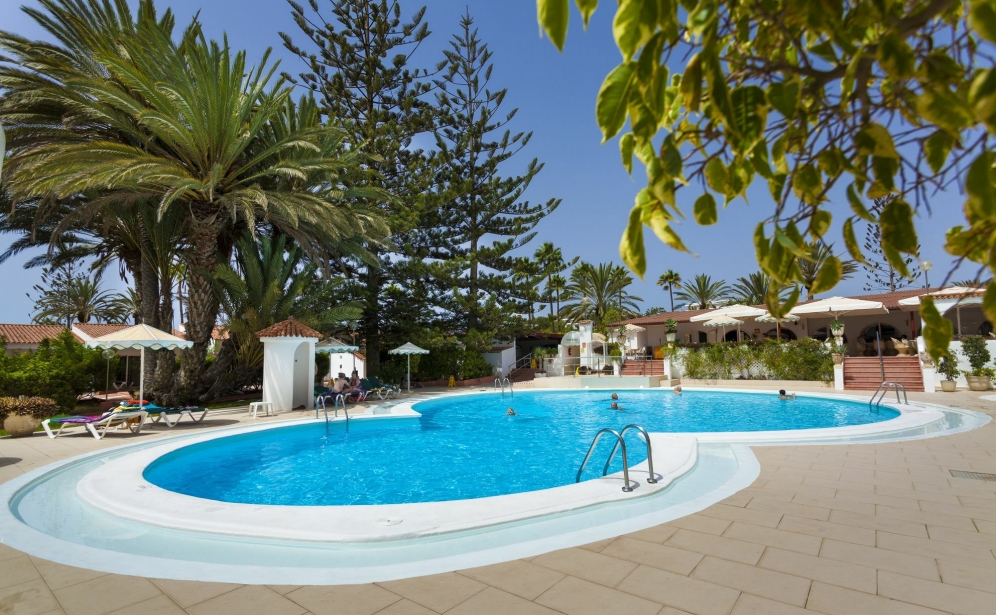 Located in a quiet yet central location in Playa del Ingles, the hotel is about 400 m away from the dunes of Maspalomas and its sandy beach. The Kasbah and Metro shopping centres with their numerous shops, bars and restaurants are to be found 200 m away. Gran Canaria Las Palmas Airport is around 20 km away.||Renovated in 2011, this establishment is a bungalow complex with grounds spanning over 600 m², including restaurants and gardens. The hotel is focused on offering guests family holiday enjoyment. Fully air-conditioned, it welcomes guests in its lobby at the 24-hour reception which offers a 24-hour check-out service and a hotel safe. Refreshments are served at the café and bar. The complex also offers guests a laundry service.||The apartments have a separate bedroom, kitchenette with fridge and minibar, plus a safe and satellite/cable TV. A telephone is also provided and a double bed comes as standard. The en suite bathroom features a bath and guests can relax on their balcony or terrace.||The hotel has two large outdoor heated swimming pools, one for adults and one for children, surrounded by a sun terrace with sun loungers and parasols. Guests can treat themselves to refreshments at the poolside snack bar. For an additional fee, guests can make use of the sun loungers at the nearby sandy beach. Fans of the fairway can tee off at the golf course located around a 5-minute drive from the hotel.||A buffet breakfast is served in the morning, whilst lunch can be taken à la carte. Dinner comes in buffet or à la carte form.