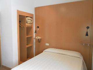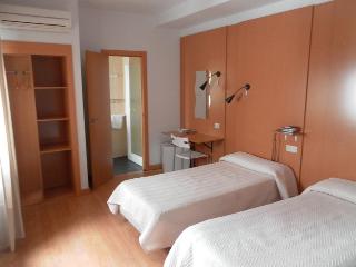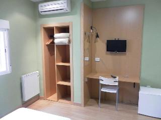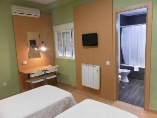 This air-conditioned hotel is located directly in the commercial and historical centre of the city, next to Plaza del Ayuntamiento, Plaza Alta, Puerta de Palmas and the well-known Menacho shopping street. The bus and train station is 2 km away, the Portuguese border is 6 km away and the airport is 15 km from the hotel.||This small cosy business hotel has a total of 34 guest rooms over 3 floors, some featuring a wide terrace. Facilities include a 24-hour reception desk in a small entrance hall, conference facilities with WLAN Internet access, lift, small café, hotel safe, TV lounge, and room and laundry services. For an additional fee, guests can avail of the garage (on prior request).||The wide and functional en suite rooms come equipped with bath, hairdryer, direct dial telephone, satellite/cable TV, safe, minibar, central heating and individually regulated air conditioning.||A continental breakfast is served in the café on the first floor of the hotel. Guests can also enjoy lunch and dinner from a varied set menu of the day.