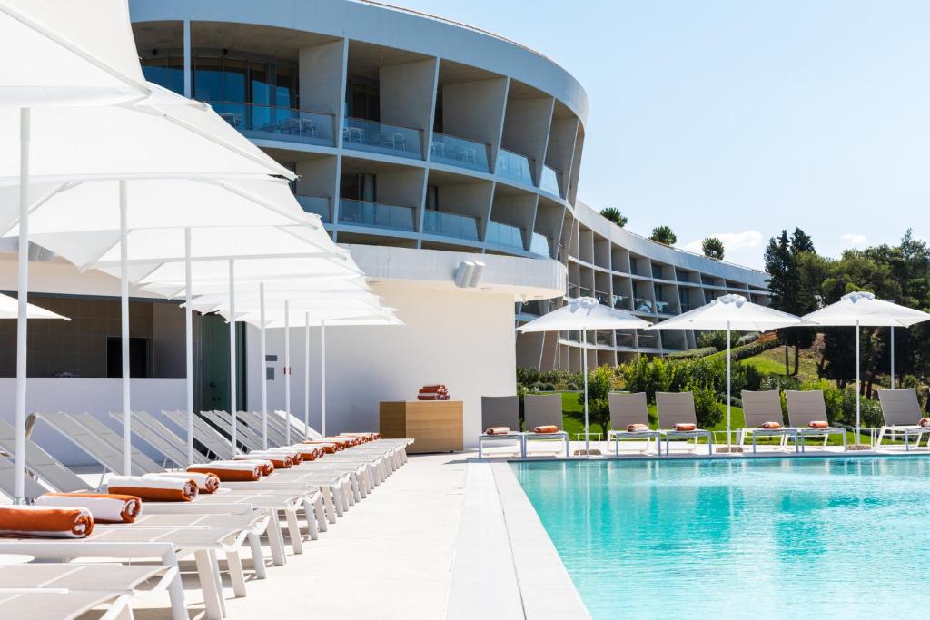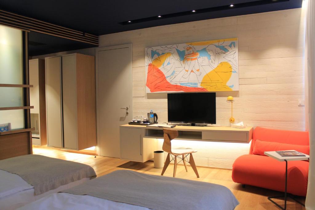 D-Resort Šibenik features an exceptional architecture and design, which complements the environment. Natural materials and pure, distinctive white concrete facade reflect the spirit of the Mediterranean, creating a new vista of the city of 'ibenik. Walkway leading to the hotel roof offers a magnificent view of the sea, marina and 'ibenik, making D-Resort a unique tourist destination in Croatia. Hotel interior is enriched with numerous artworks made by renowned Croatian authors, like wooden sculptures in the hotel lobby, impressive ceramic mural with nature motifs, and paintings in every one of its 69 rooms.
