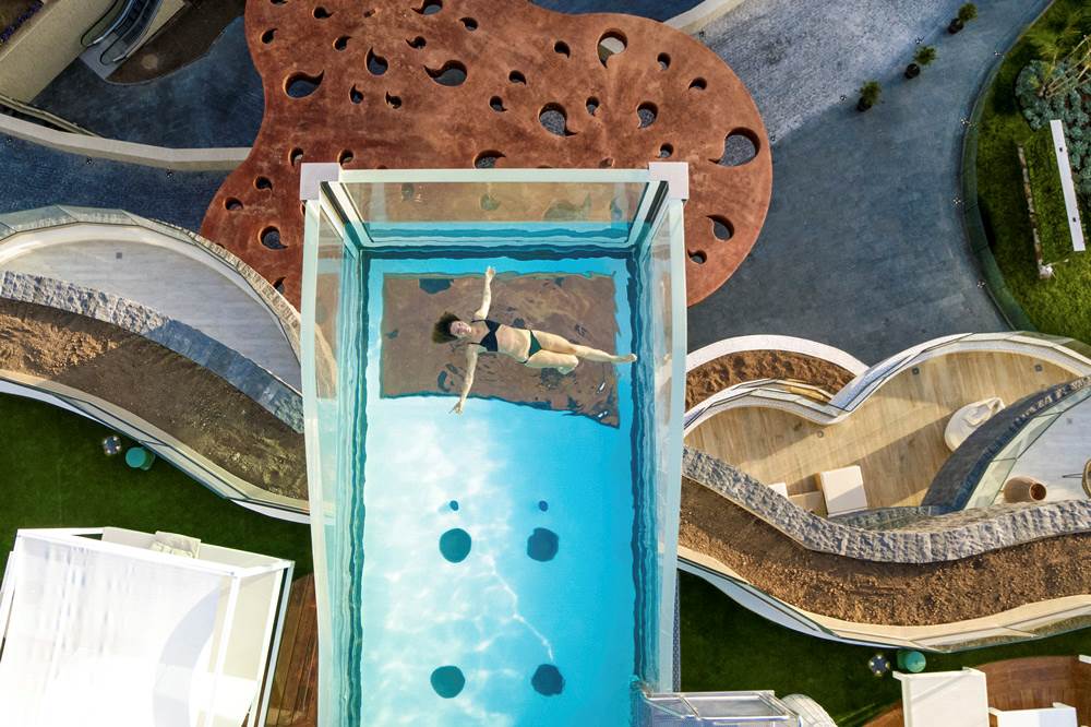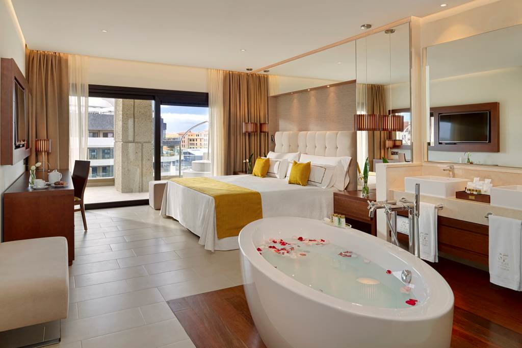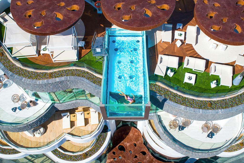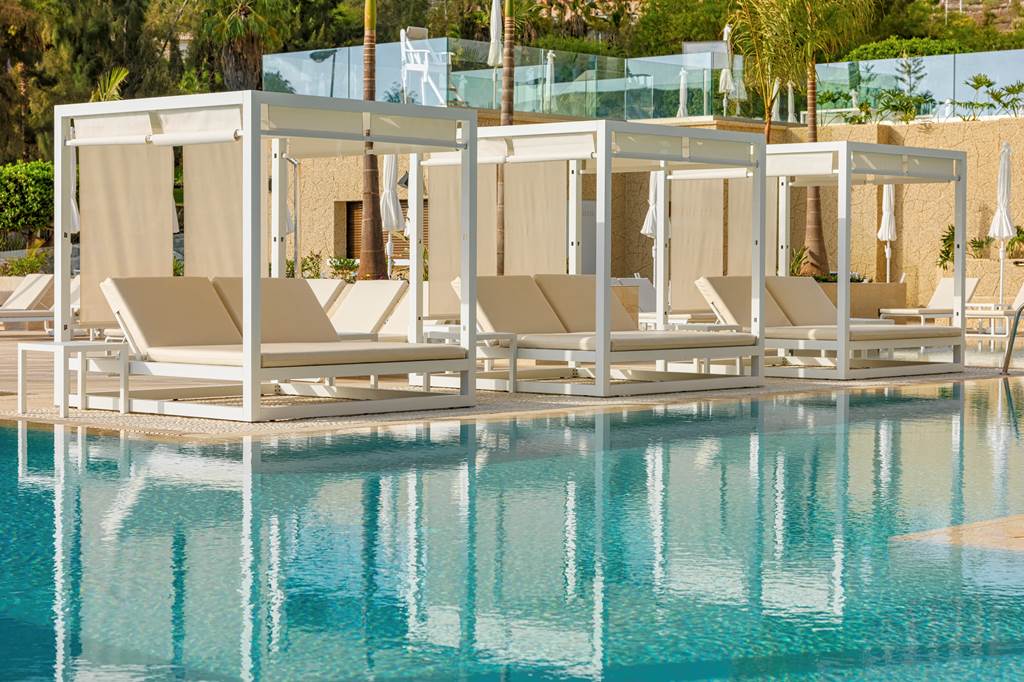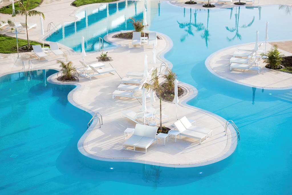 Inaugurated in December 2017, GF VICTORIA*****GL was designed with the health and wellness of families at its heart. Enter the spacious and bright lobby and start your journey of wonderful experiences and new sensations.|From our beautiful and diverse pool zones, choose your preferred place to relax; perhaps the exclusive adult pool, the family area or, for complete freedom, the naturist pool on the private roof terrace. Meanwhile, children can make new friends and let off steam in our aquatic park, which includes the exciting surf pool (extra charge of 10 €) and a wealth of activities for each age-group. |In our chill-out Sky Bar Zambra, sip your favourite drink whilst watching the spectacular views over the ocean as the sun slips slowly below the horizon. Here, you can take a swim in our stunning glass pool, with transparent walls and bottom, overhanging the façade of the hotel.