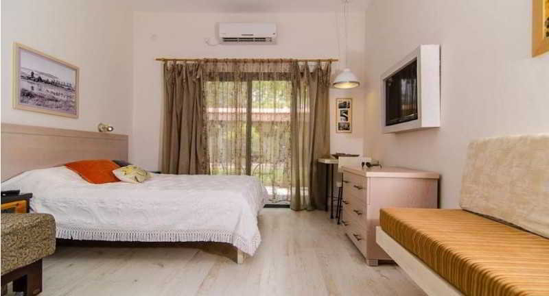 This kibbutz is located just 5 km (a few minutes' drive) south of Tiberias, with its incredible variety of historical sites. It is a great base from which to explore the Upper Galilee, Golan Heights and Jordan Valley, along with a number of other famous sites including Gamla, Safed, the hot springs of Hamat Gader, the archaeological sites of Beit Shean and the water parks of Tzemah and Lina Gal.||This quiet, pleasant hotel has a total of 43 accommodation units, all on the ground floor, and offers barbecue facilities, highchairs for babies, a safety deposit box, conference rooms and an ATM cash machine. Further facilities include a lobby with 24-hour reception and a dining room. The property is fully air-conditioned. Wireless Internet access is available free of charge in the public areas and guest rooms.||The rooms all feature an outdoor seating area with a table and chairs, where guests can enjoy the beautiful surrounding landscape and the attractive lawns of the Kibbutz. All are equipped with air conditioning, heating, a cable TV, a coffee corner with kettle, a mini fridge and an indoor seating area. An en-suite bathroom with shower comes as standard.||There is an outdoor swimming pool within the hotel grounds, with parasols laid out at the poolside. Guests can use the on-site sauna and gym for an additional fee. There is also an indoor basketball and volleyball court and a tennis court on the premises. Just some of the sporting activities available in the area are rafting at Jordan Park, jeep touring and boating.||Israeli breakfast is served fresh every morning, in the air-conditioned dining room.