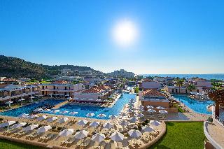Featuring a prime position close to the crystal clear waters of the Aegean Sea and the harmony of nature, this luxurious resort, one of the largest hotel complexes in Rhodes, perfectly combines with the luxury of the present age. The resort stretches in an impressive area of 120000 sqm and stands out as an oasis surrounded by water and vegetation, distinguishing it from the unpleasant modern structures with their impersonal concrete floors and packed rooms. The eco-friendly hotel creates a unique atmosphere of luxury and tranquillity with first class facilities and high standard accommodation options. Guests will also appreciate the superb spa & wellness area of 1200 sqm and the marvellous sand and pebble beach with crystal-clear waters, reachable by a private underground passage and awarded the blue flag.