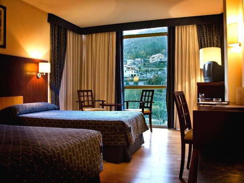 The hotel is 70 km from the capital of the province Ourense, and 6 km from Portugal on the road to Fronteira da Portela do Homem. Facilities on offer at the hotel include a hotel safe, hairdressing salon and a games room. Younger guests may enjoy the children's playground and the kids' club. Dining options include a cafe, a bar and a restaurant. Conference rooms and a parking are also provided. There is wireless Internet access in public areas. Each room has an en suite bathroom with a shower, bath and a hairdryer. The units are fitted with double or king-size beds, a TV and Internet access. Further amenities include a safe and a minibar. The rooms have air conditioning and heating. The hotel has its own spa centre and access to the indoor thermal pool, gym, aqua and fit sessions. Guests can also relax on sun loungers on the sun terrace or unwind in the hot tub, sauna or steam room.