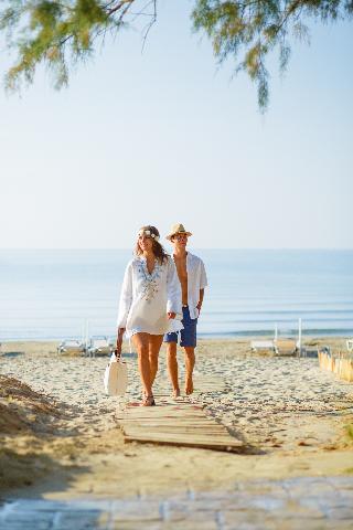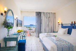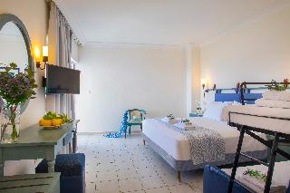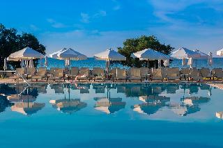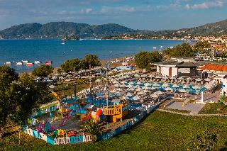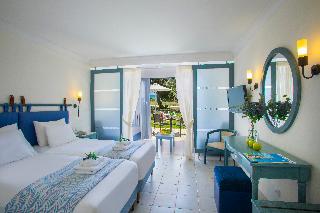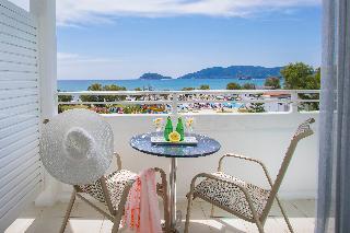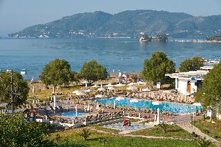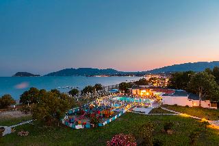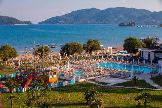 The hotel is situated on the enchanting Laganas Bay, well known as the nesting area of the Kareta-Kareta turtle. It is surrounded by beautiful and extensive gardens, which cover a total area of 230 hectares of forest and extend right to the golden Beach of Laganas. Zakynthos is one of the most beautiful and picturesque of the Greek islands and the town is only is only 8 km away, while the nearest shops are around 2 km away, making the hotel truly idyllic and well worth discovering.||The hotel includes 268 rooms across main and neighbouring buildings. Facilities available at the hotel include an entrance hall, air conditioning, a hotel safe, a TV room, a restaurant, Internet access (charges apply) a laundry service (charges apply) a kids' club and a children's playground. Guests will also find multilingual staff, a small supermarket, a hairdressing salon, a currency exchange, bike and car rental, a porter service, lifts and a doctor on call. There is parking provided for those arriving by car.||The hotel has twin rooms, all equipped with direct dial telephone, hairdryer, centrally regulated air conditioning, fridge, safety deposit box (at a charge), satellite TV, radio and bathroom with shower and WC. There is also a private balcony or veranda with inland or sea view.