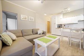 Brand new modern furnished apartment located on the 7th floor (with an elevator) in Praga district, right next to new metro station Dw. Wileński.|Apartment consists of two bedrooms with double beds. There is also a fold out sofa for 2 in the living room with a balcony. Fully equipped kitchen with everything you might need to prepare your meals – dishwasher, induction hob, oven, fridge, microwave, kettle. Bathroom with bathtub and shower, washing machine, washbasin and towels. There is also an underground parking place for your car. Bed linen, towels, WiFi and cable TV are included.