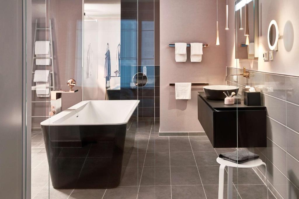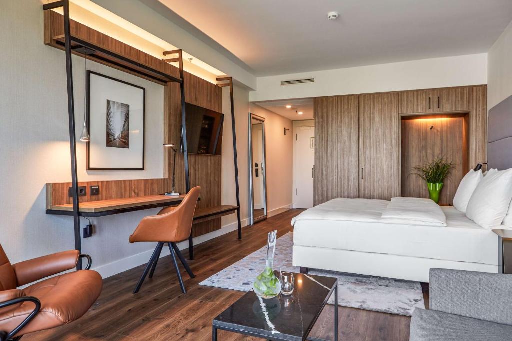 The first thing that strikes about this contemporary hotel is its spectacular architecture. It is situated only 1 km away from the Frankfurt Trade Fair Center, easily reachable by tram. The hotel features 428 rooms, 24-hour reception, express check-in and check-out, currency exchange, free WIFI throughout, meeting rooms, 24-hour business centre, restaurant, 2 bars, fitness centre, spa and wellness, top floor indoor pool, medical assistance and on-site parking. Wheelchair accessible. Pets allowed on request.