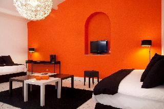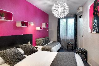 « Intentionally young, pop and visual, we have come up with a decor in harmony with the surprising «labyrinth configuration» of the hotel. This maze of little neighbourhood residences just a stone's throw from the medieval city is irresistible!»|Discover our urban and contemporary hotel at the foot of the medieval city of Carcassonne.|Rich with a strong history, this feudal monument is classified in the world patrimony of Unesco.|Live privileged moments in a design and pop environment.|Lounge bar, relax by the outdoor heated pool (28°c) from Easter to early November.|Relaxation, pleasure and absolute refinement in our luxury SPA CARITA DECLEOR.|18 rooms and 3 suites High colored. Design and pop environment. Air conditioning, flat screen TV, Bathroom with bath-shower and WC.