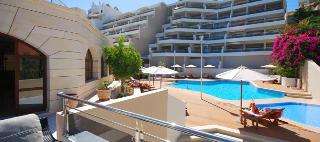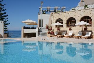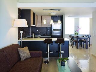 This modern apart hotel enjoys fantastic views over the Mediterranean Sea from its excellent location on the coast of Crete. The centre of Rethymnon is within a short stroll, attractions such as the Venetian Castle or beautiful beaches are easily reachable. The international airports of Chania and Heraklion are at a distance of approximately 62 km and 75 km, respectively.||The spacious and modern suites are fully furnished. Each has a luxurious bathroom with spa bath, a kitchen with dining area and a living room. ||During the summer, guests of the Macaris Suites can enjoy 1 outdoor swimming pool and 1 outdoor children's pool. All year around you can enjoy the indoor pool and hot tub which are located in the spa centre available for adults only. From June to September on the roof garden a la carte restaurant -bar, dinner and drinks are served offering views of the Venetian castle.