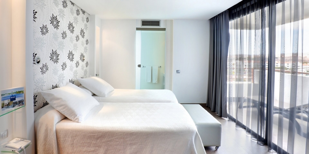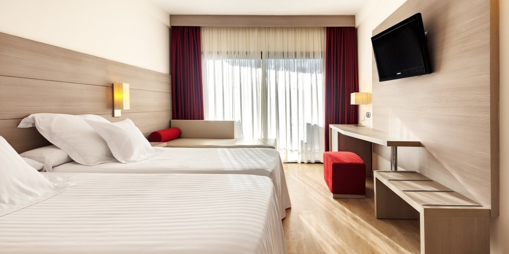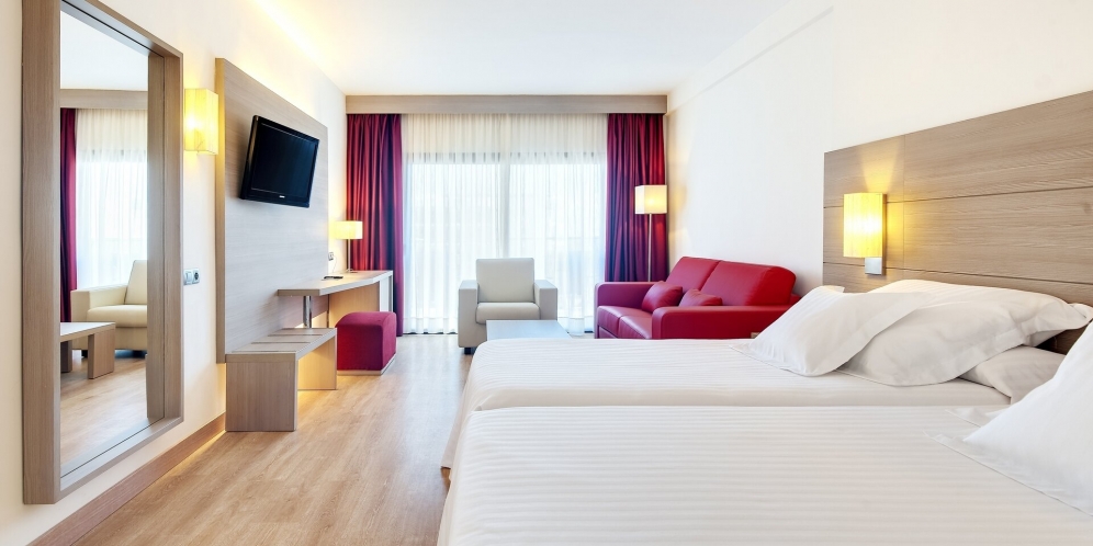 Endurnýjuð björt 45 fermetra herbergi með útsýni yfir sundlaugargarðinn.
